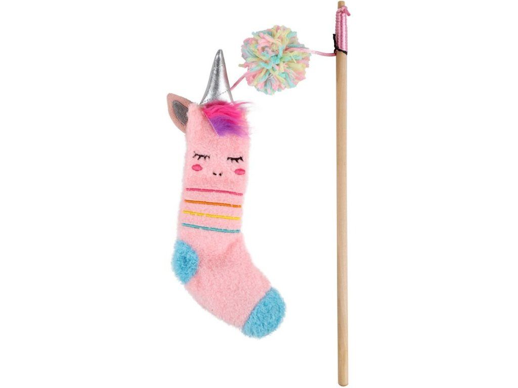 Dřevěná vábnička s hebkou růžovou ponožkou v designu jednorožce, se šantou kočičí. Celková délka 122 cm.