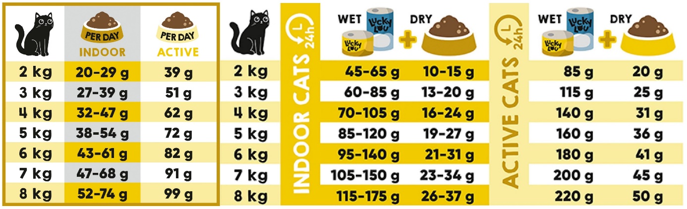 Lucky Lou receptury kombinují vše, co kočky potřebují a chtějí v jedné misce. Jsou vytvořeny tak, aby naplňovaly přirozené potřeby koček v jednotlivých fázích jejich života – protože koťata, dospělé kočky i senioři potřebují nejen jiné složení, ale i jiné množství vitamínů a živin, jinou energetickou hodnotu či velikost granulí.