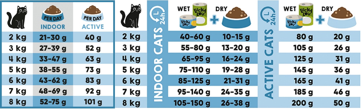 Lucky Lou receptury kombinují vše, co kočky potřebují a chtějí v jedné misce. Jsou vytvořeny tak, aby naplňovaly přirozené potřeby koček v jednotlivých fázích jejich života – protože koťata, dospělé kočky i senioři potřebují nejen jiné složení, ale i jiné množství vitamínů a živin, jinou energetickou hodnotu či velikost granulí.